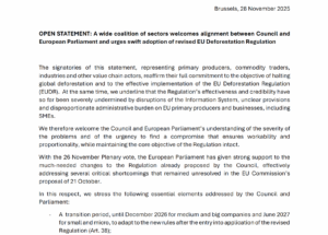 A wide coalition of sectors welcomes alignment between Council and European Parliament and urges swift adoption of revised EU Deforestation Regulation